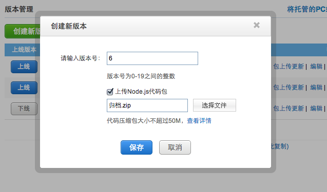 我一开始使用的是在新建版本时”上传Node.js代码包“。把之前写的一个极其简单的express示例放上去。