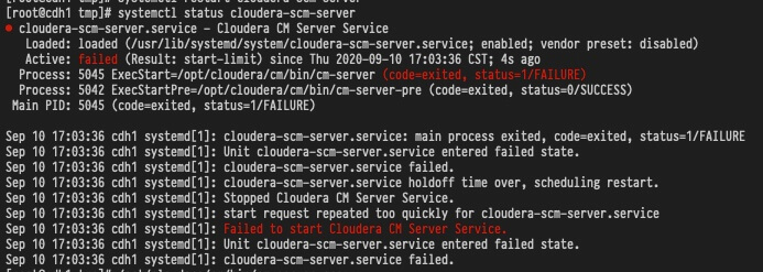 Sep 10 17:03:36 cdh1 systemd[1]: cloudera-scm-server.service: main process exited, code=exited, status=1/FAILURE Sep 10 17:03:36 cdh1 systemd[1]: Unit cloudera-scm-server.service entered failed state. Sep 10 17:03:36 cdh1 systemd[1]: cloudera-scm-server.service failed. Sep 10 17:03:36 cdh1 systemd[1]: cloudera-scm-server.service holdoff time over, scheduling restart. Sep 10 17:03:36 cdh1 systemd[1]: Stopped Cloudera CM Server Service. Sep 10 17:03:36 cdh1 systemd[1]: start request repeated too quickly for cloudera-scm-server.service Sep 10 17:03:36 cdh1 systemd[1]: Failed to start Cloudera CM Server Service. Sep 10 17:03:36 cdh1 systemd[1]: Unit cloudera-scm-server.service entered failed state. Sep 10 17:03:36 cdh1 systemd[1]: cloudera-scm-server.service failed.
