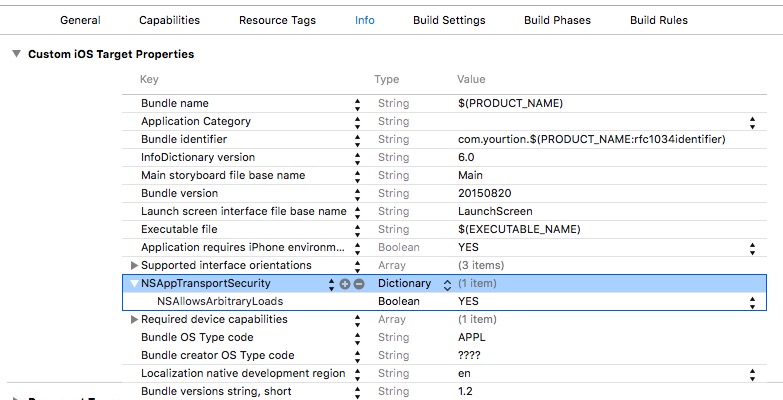 Info中添加NSAppTransportSecurity类型Dictionary; - 在