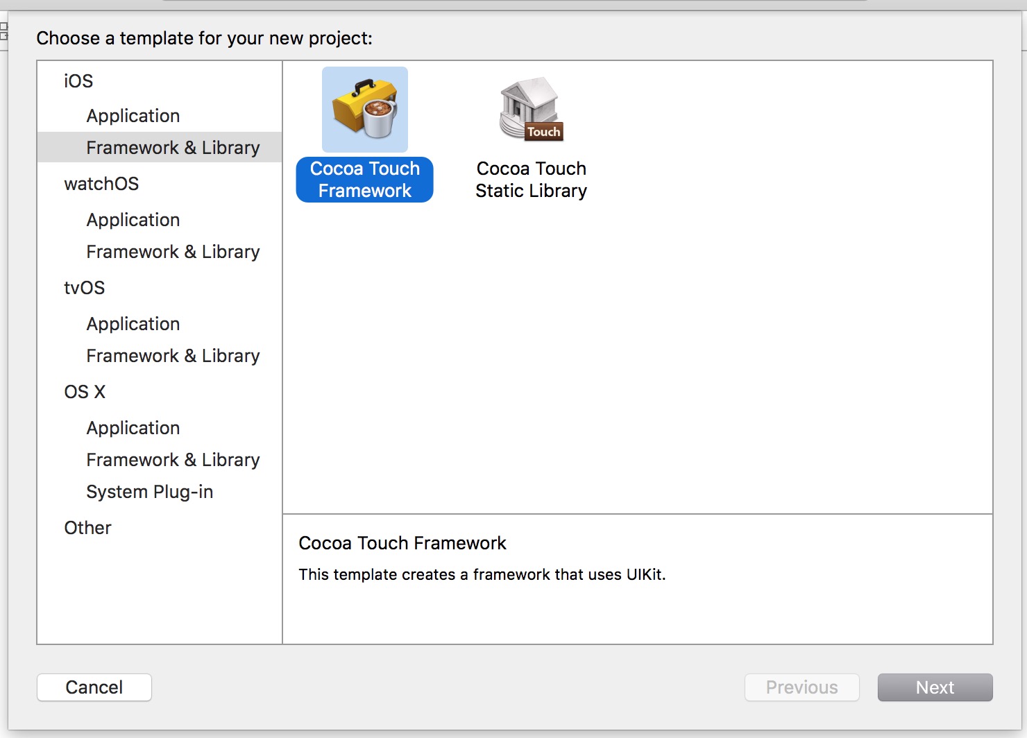 转换的方式其实也不复杂,就是新建一个 Project,并选择 Framework & Library 中的 Cocoa Touch Framework,其他的设置跟新建其他项目一致,新建完项目后就把原有的代码放到 Framework 工程中,能 Build 成功就基本没问题了。