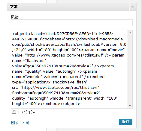 然后将代码复制到里面,最重要的一部就是根据你主题的侧边栏大小修改Flash的长度还有你喜欢的高度
